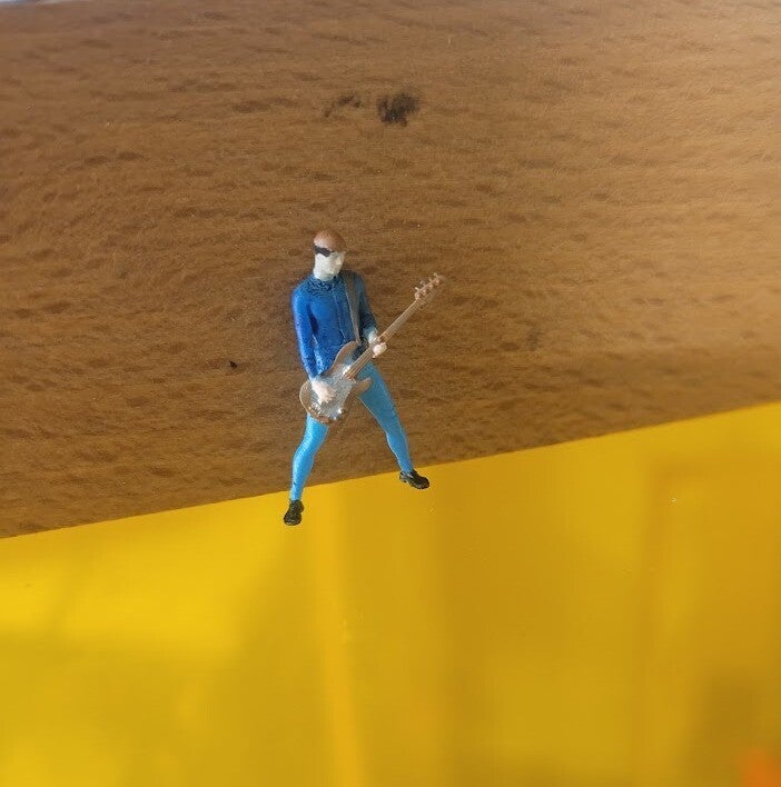 Sur la scène, un groupe orchestré minutieusement assemblé et peint donne vie au concert. On retrouve un batteur, des guitaristes, un clavier/synthétiseur, ainsi qu'une chanteuse énergique, tous prêts à faire vibrer le public miniature. Deux enceintes imposantes viennent compléter l'ensemble pour restituer une ambiance sonore réaliste et percutante.