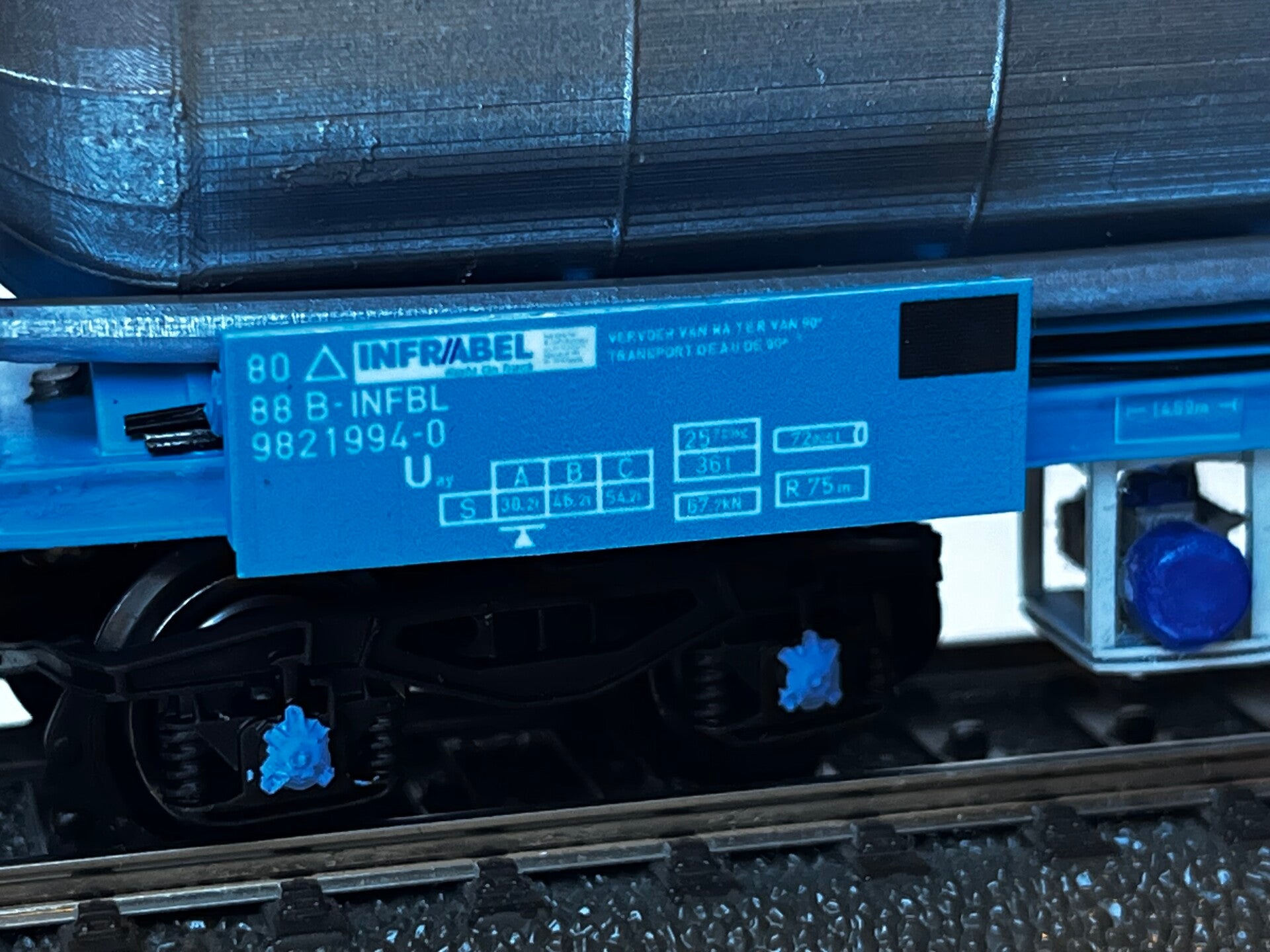 Le wagon citerne H2O d’Infrabel est un véhicule ferroviaire spécialisé utilisé pour l’entretien du réseau, notamment pour les opérations de désherbage et d’arrosage. En maquette, il se distingue par sa silhouette simple mais technique : une citerne cylindrique montée sur châssis, équipée de dispositifs de pulvérisation et de raccords visibles.